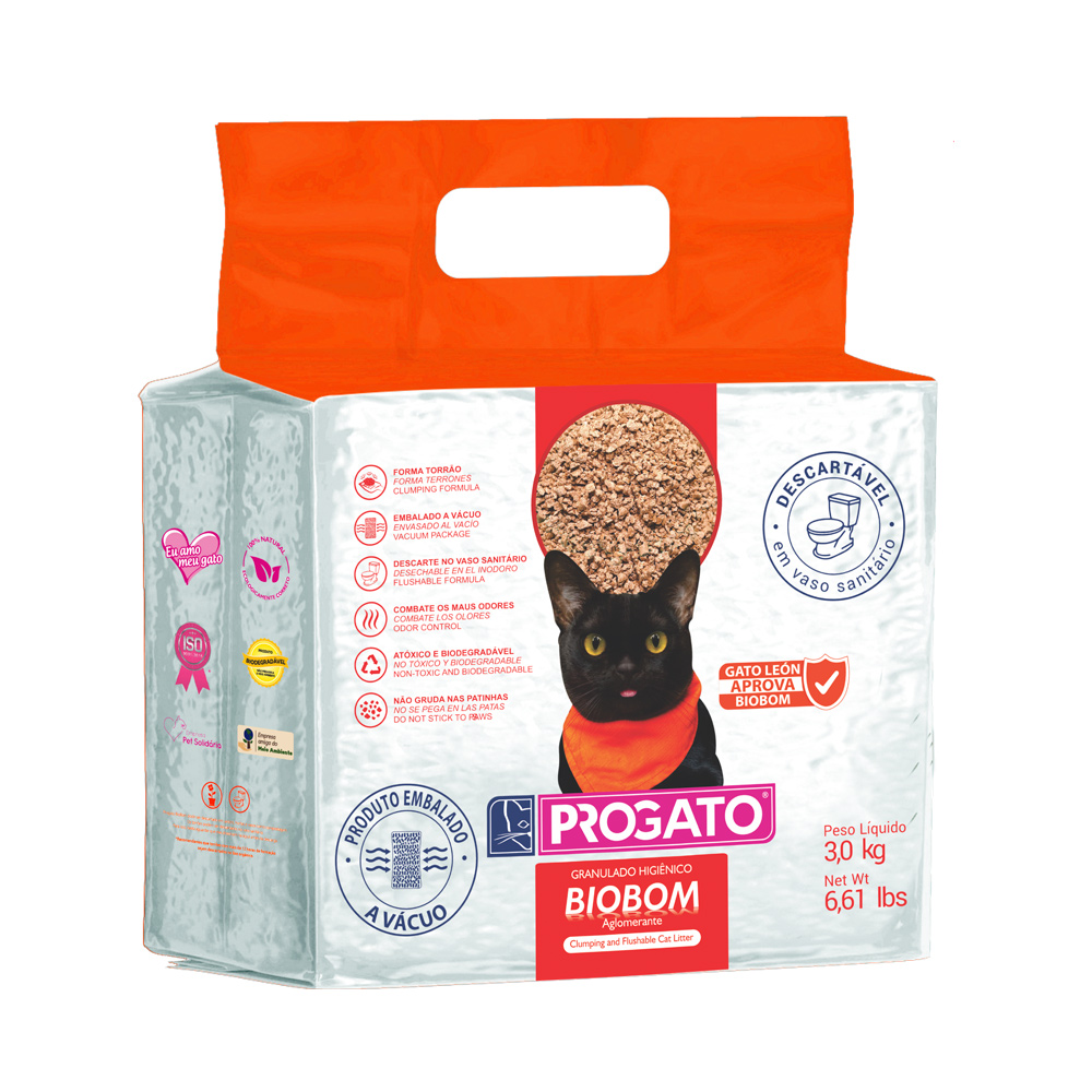 O Granulado Higiênico ProGato Biobom é produzido com ingredientes 100% vegetais, sendo uma alternativa natural, biodegradável e segura para o seu gato e para o meio ambiente. Seus grãos proporcionam ótima absorção da urina, neutralizam odores e formam torrões firmes que facilitam a remoção e limpeza diária. O produto não levanta poeira, não gruda nas patinhas e pode ser descartado no vaso sanitário.